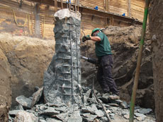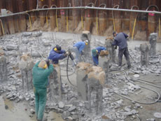 Als Hersteller von Pfahlgründungen, legen Sie selbstverständlich Wert auf einen sauber gekappten Pfahlkopf. Da wir die Kapparbeiten ausschliesslich von Hand, das heisst mit speziellen Presslufthämmern ausführen, wird der zu kappende Überbeton des Pfahls auf schonende Weise abgebrochen, so daß es zu keinerlei Rissbildungen bzw. Abplatzungen im Bereich des zu erhaltenen Pfahls kommt. Der Kappvorgang wird so ausgeführt, daß der Pfahl einen leichten Überstand gegenüber der Sauberkeitsschicht aufweist.